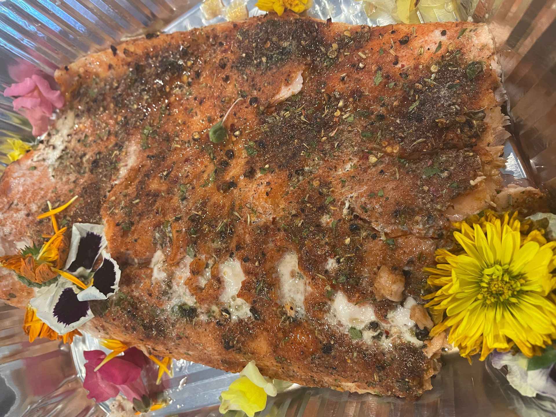 Fresh whole salmon wrapped in puff pastries topped with spinach and cheese mixture additonal $7 per person