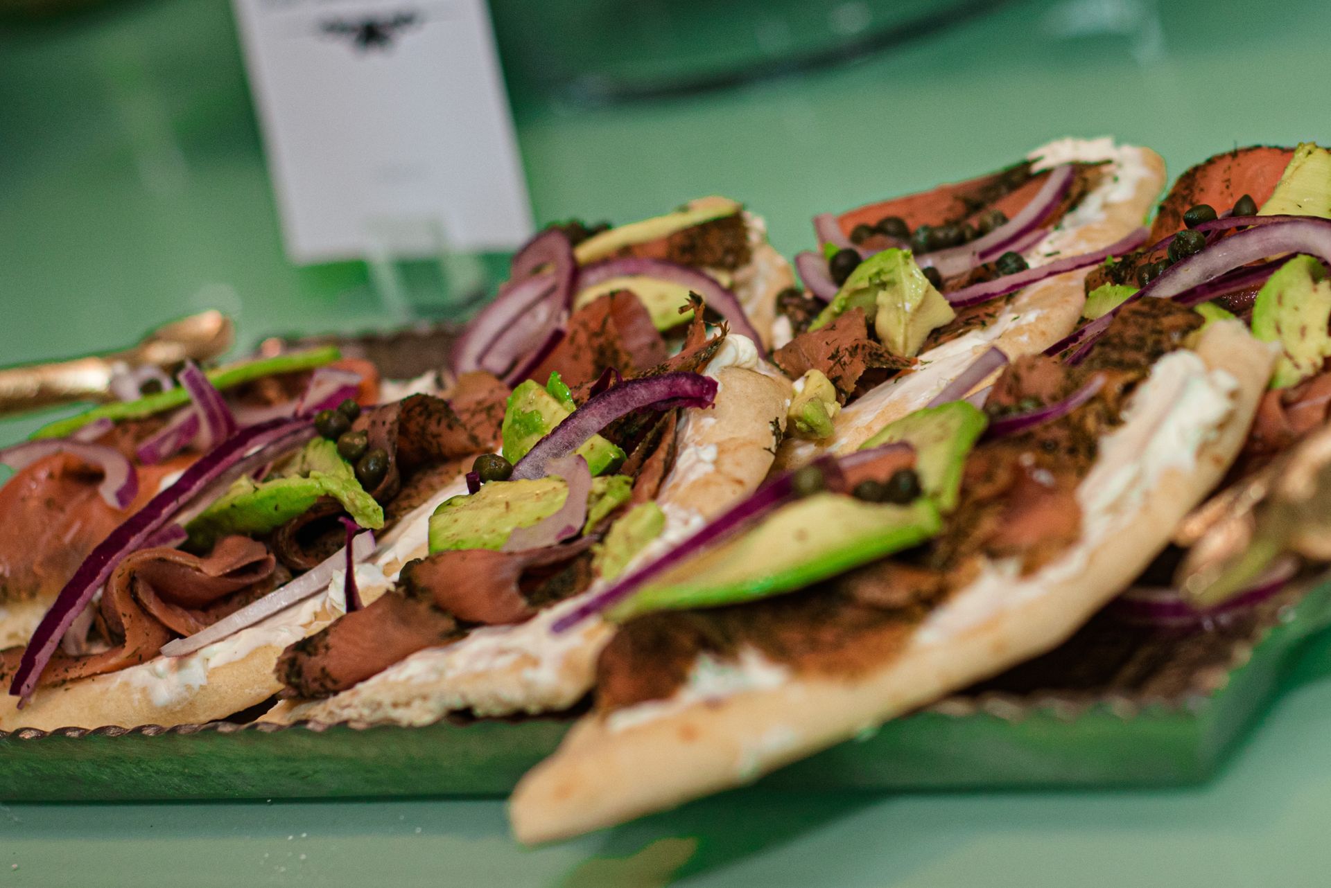 smoked salmon atop a tortilla with capers, red onions & avocado cream cheese crema