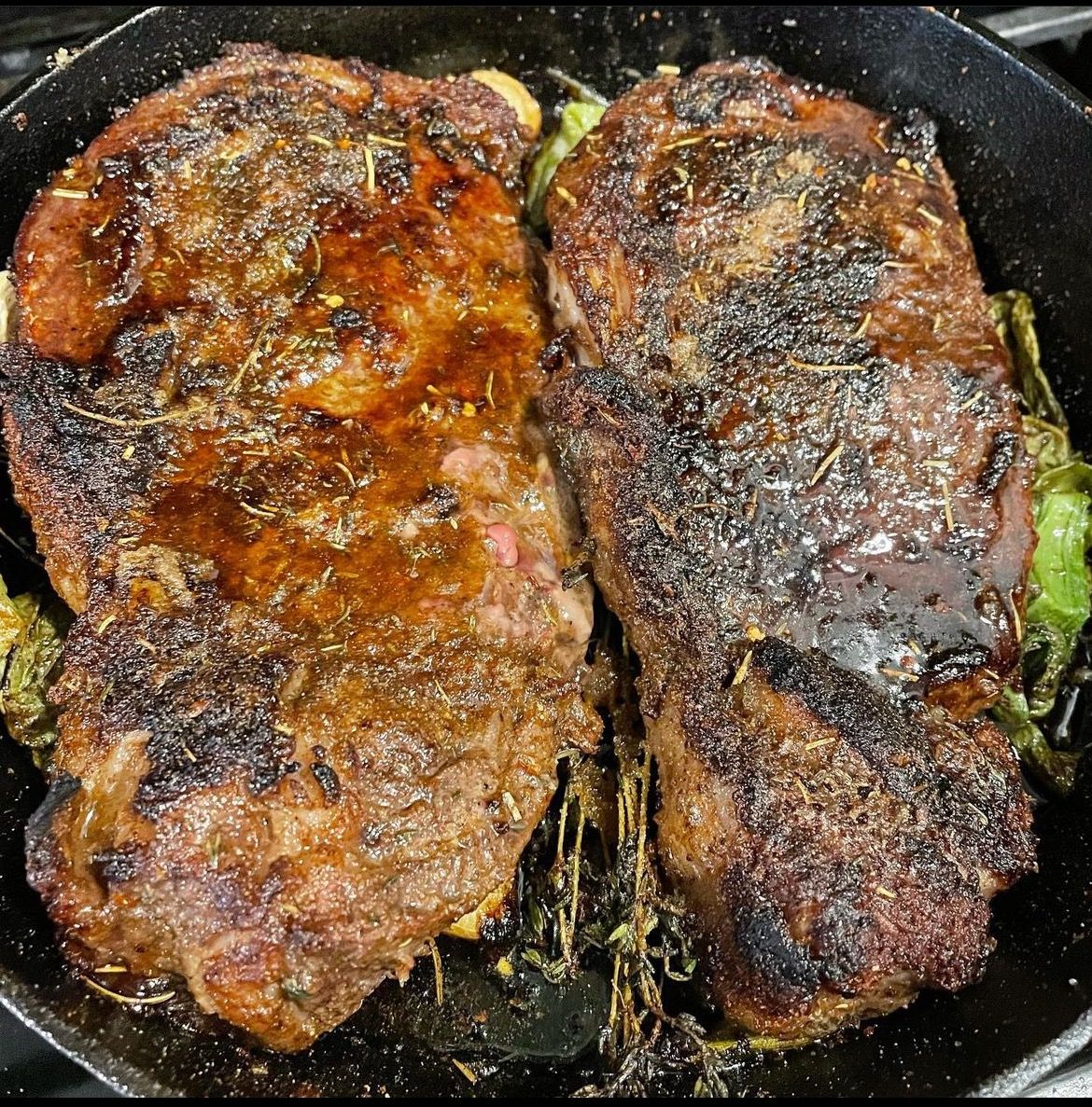 Seared 10 oz rib eye steak cooked with garlic and herb butter or a pineapple mango jerk sauce